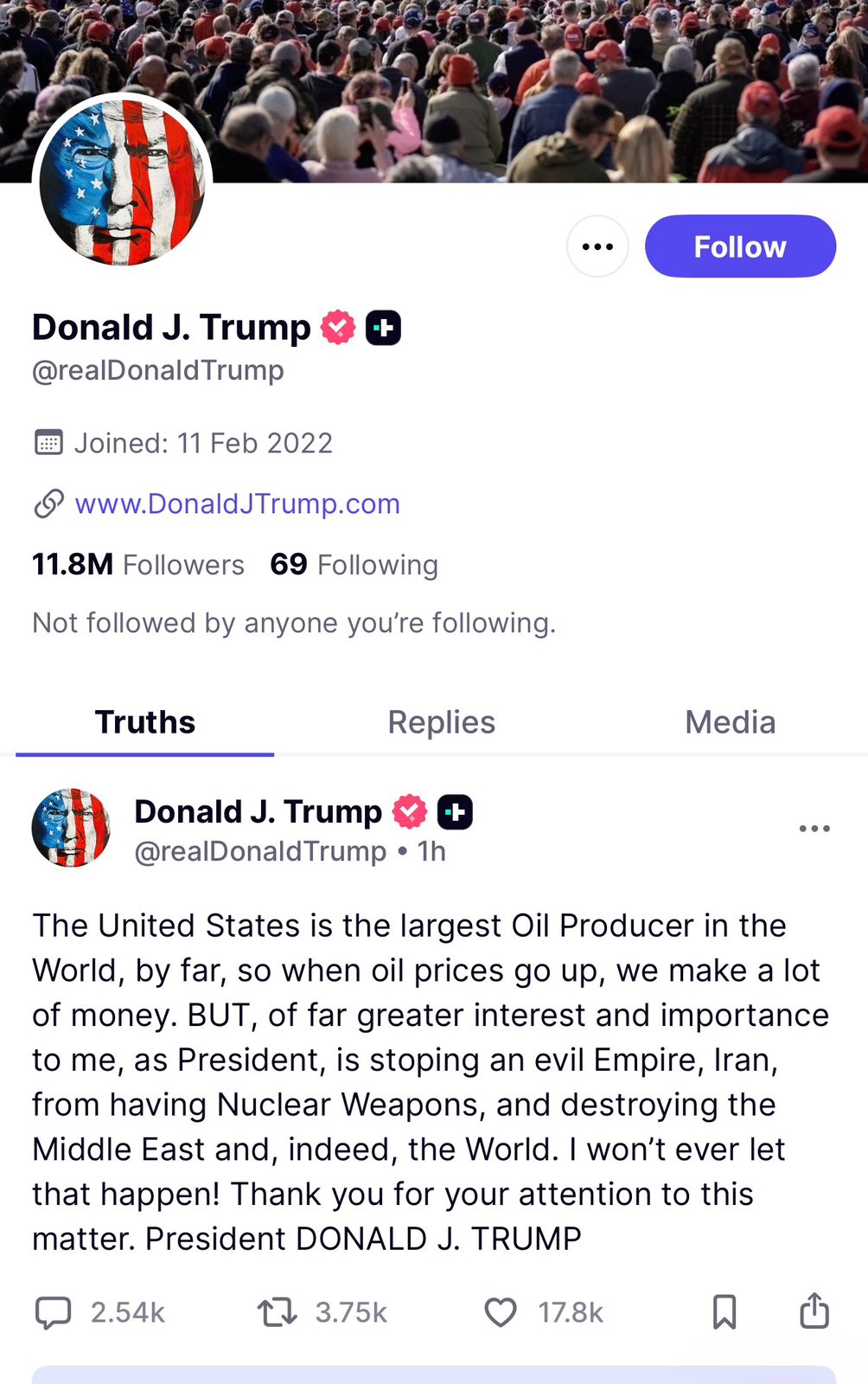 सर्बोच्च नेता खामेनीको सम्बोधन लगत्तै अमेरिकी राष्ट्रपति ट्रम्पले सामाजिक सञ्जालित ट्रुथ सोसियलमार्फत अब अमेरिका तेल बेचरै सबैभन्दा धेरै पैसा कमाउने देश बन्ने उल्लेख गरेका छन । उनले विश्वमा सबैभन्दा धेरै तेल अमेरिकासँग भएको दावी पनि गरेका छन ।