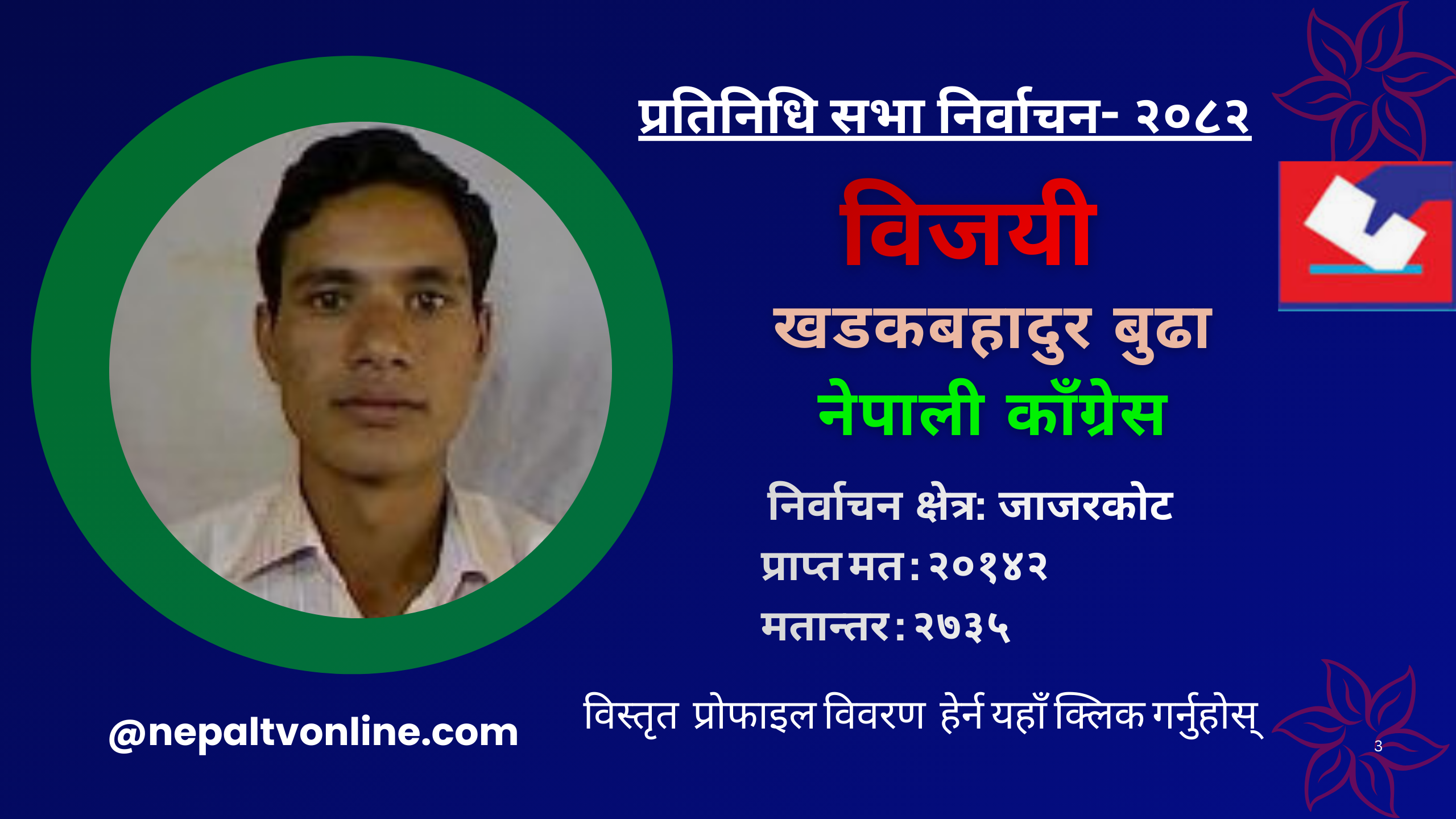 काठमाडौँ- प्रतिनिधि सभा सदस्य निर्वाचन अन्तर्गत जाजरकोटबाट नेपाली काँग्रेसका खडक बहादुर बुढा निर्वाचित हुनुभएको छ । उहाँ २०१४२ मतसहित विजयी हुनुभएको हो । उहाँका निकटतम् प्रतिद्वन्द्वी नेकपाका शक्तिबहादुर बस्नेतले १७४०७ मत प्राप्त गर्नुभयो ।