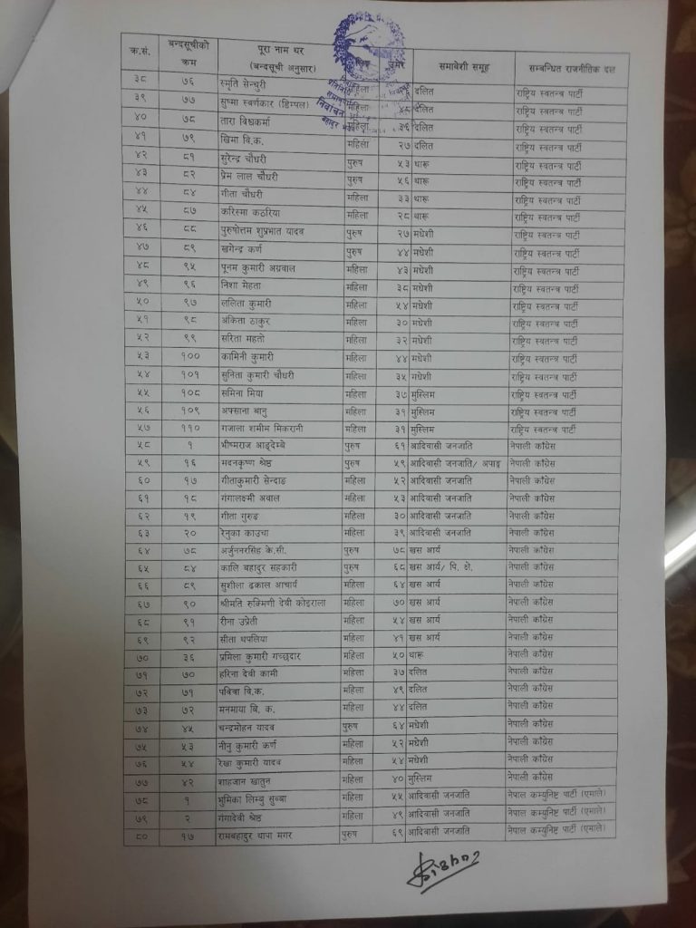 समानुपातिक तर्फबाट निर्वाचित हुने सांसदहरु नामवाली