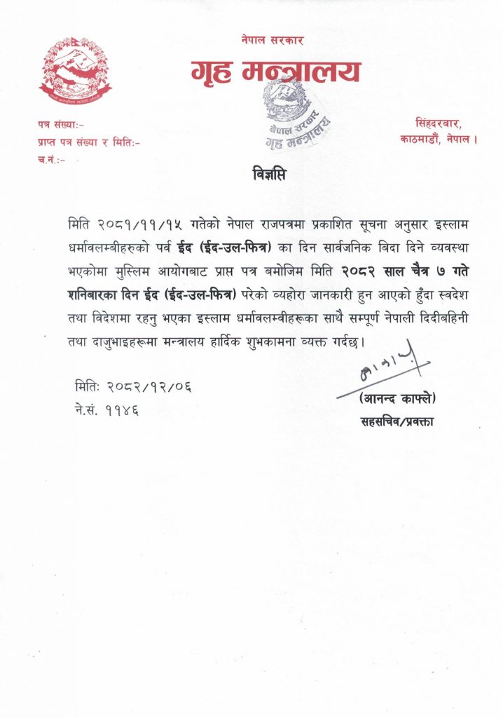 काठमाडौँ- अरबी पात्रो हिजरी संवतअनुसार नवौँ महिनामा निराहार व्रत गरेका देशभरका मुस्लिम समुदायले विशेष नमाज पाठ गरी ठूलाबडाबाट आशीर्वाद लिएर आज इद उल फित्र पर्व मनाउँदै छन् ।