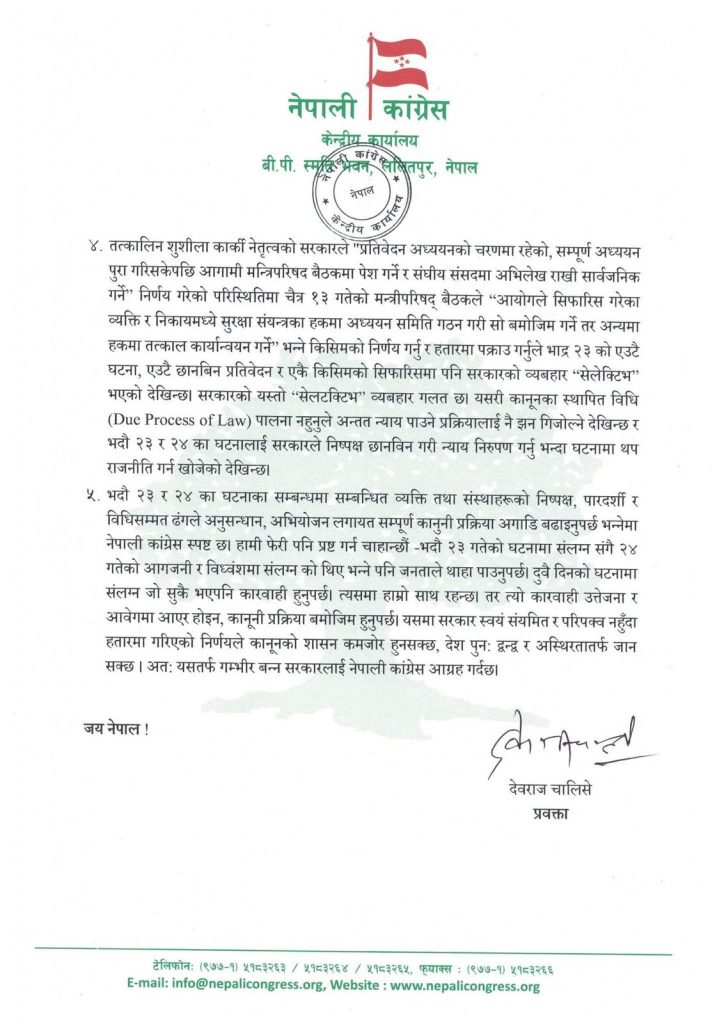 नेपाली कांग्रेस ले २०८२ साल भदौ २३ र २४ गते भएका घटनाबारे पुनः निष्पक्ष छानबिन र कानुनी प्रक्रिया अपनाउन सरकारसँग आग्रह गरेको छ।