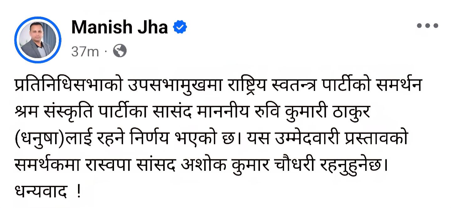 काठमाडौँ- प्रतिनिधिसभाको उपभामुख पदका लागि राष्ट्रिय स्वतन्त्र पार्टीले श्रम संस्कृति पार्टीकी रुवीकुमारी ठाकुरलाई समर्थन गर्ने भएको छ ।