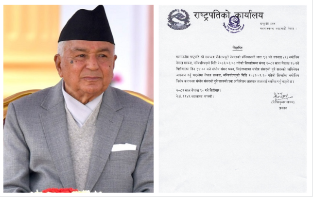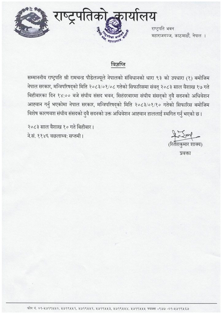 काठमाडौँ- राष्ट्रपति रामचन्द्र पौडेल ले संघीय संसद्को दुवै सदनको अधिवेशन हाललाई स्थगित गर्नु भएको हो ।