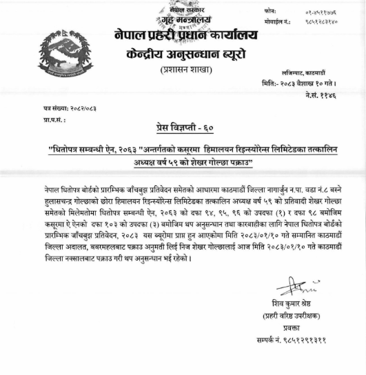 नेपाल धितोपत्र बोर्डको छानबिन प्रतिवेदनका आधारमा अनुसन्धानका लागि गोल्छालाई नियन्त्रणमा लिएको नेपाल प्रहरीको केन्द्रीय अनुसन्धान ब्यूरोले जनाएको छ ।