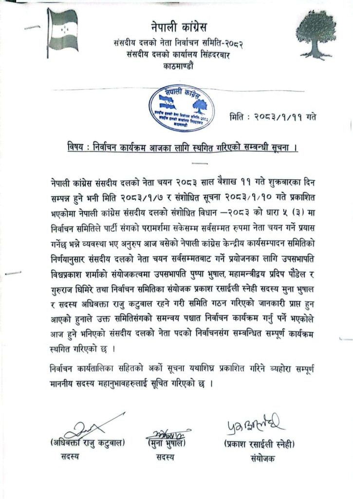 अन्तिम समयमा आएकर कांग्रेसले निर्वाचन कार्यक्रम स्थगित गरेको प्रेस विज्ञाप्तिम मार्फत जानकारी गराएको छ ।