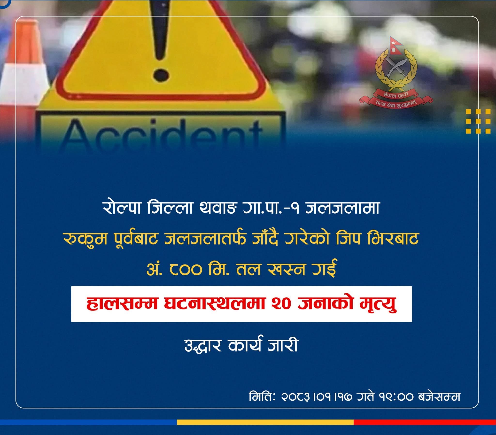 काठमाडौँ- रोल्पाको थवाङ गाउँपालिका-१ को  जलजला जाने बाटोमा जीप दुर्घटना हुँदा मृत्यु हुनेको संख्या २० पुगेको छ । प्रहरीका अनुसार घटनास्थलमा नै २० जनाको मृत्यु भएको हो ।