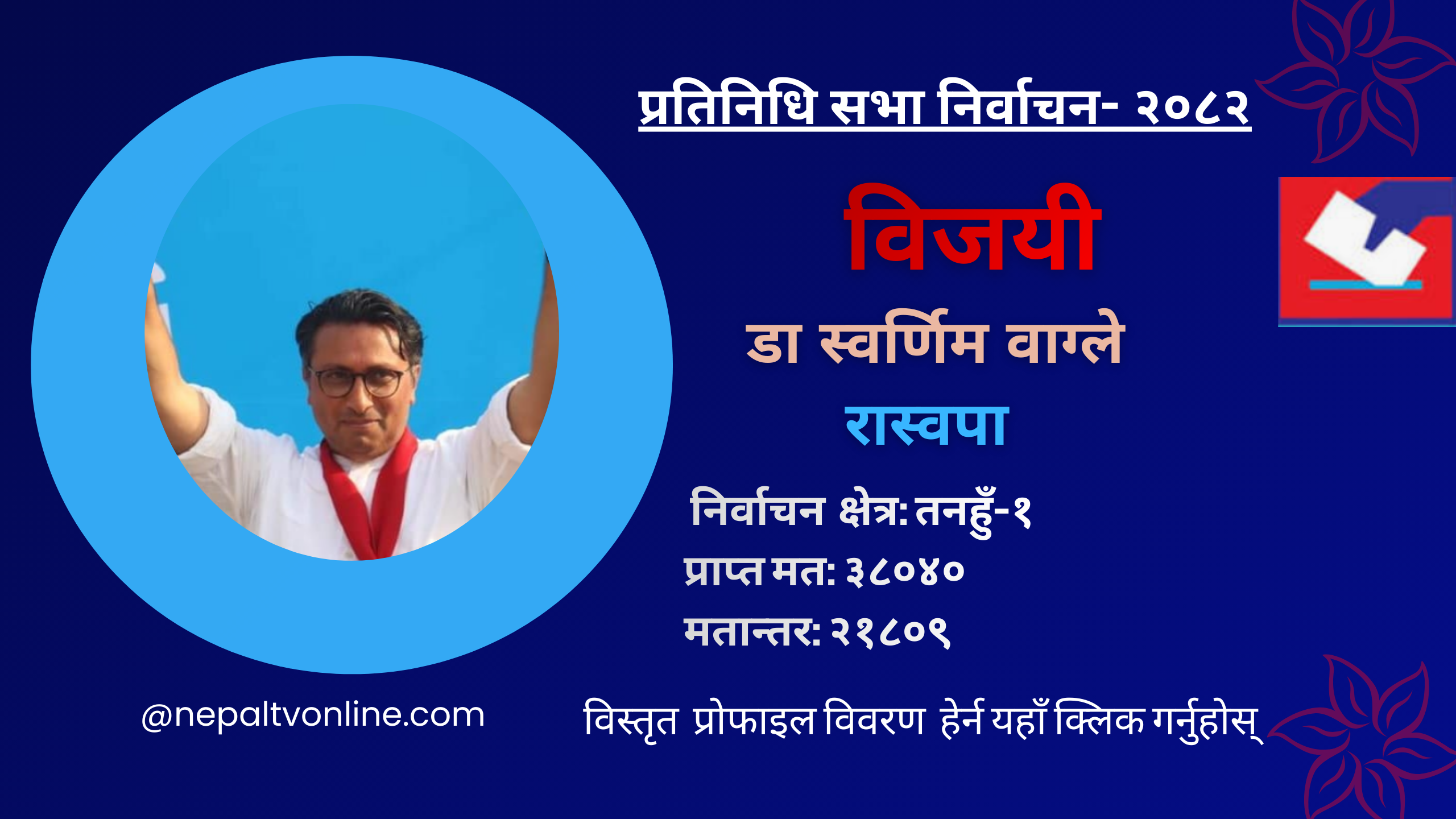तनहुँ- तनहुँ-१ बाट रास्वपाका डा स्वर्णिम वाग्ले विजयी हुनु भएको छ । डा वाग्लेले ३८ हजार ४० मतसहित विजयी हुनुभएको हो ।